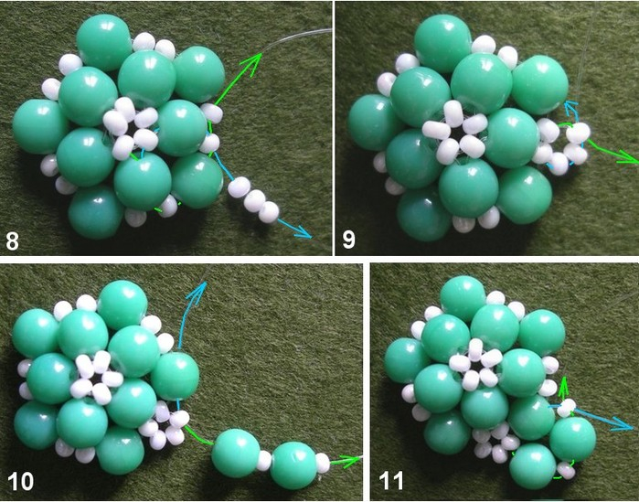 Присоединять их нужно на отдельные бисеринки шарика. Обшейте иголочками весь шар, чтобы о стал больше. Это поможет вам изготовить ожерелье из бусин бисера своими руками.