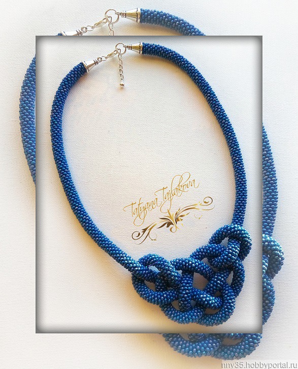 Еще один очень красивый вариант, как завязать лариат из бисера – заплести его по всей длине в узлы, а свободные края замкнуть в кольцо. Он будет в виде короткого колье.