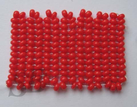 Кирпичное плетение Бисерное полотно, сплетенное в технике кирпичного плетения, выглядит так же, как полотно, сплетенное в мозаичной технике. Однако способы плетения кардинально различаются, что дает возможность использовать кирпичный стежок там, где мозаичная техника не подошла бы, и наоборот. В данном случае можно использовать трафареты из мозаичного плетения. Трафарет с приплюснутыми бисеринками (особенно актуально для чешского бисера) Трафарет с круглыми бисеринками