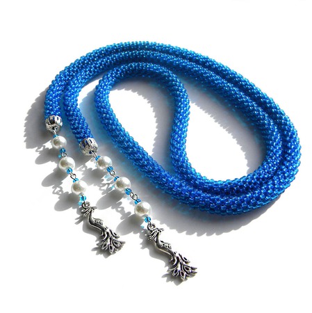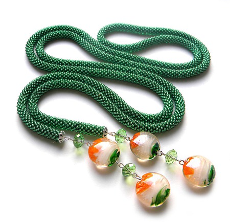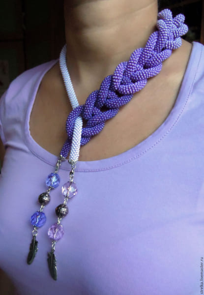Бисерные жгуты (лариаты) смотрятся очень красиво и выигрышно, их носят как ожерелья, браслеты, серьги, пояса и даже используют для украшения сумок.