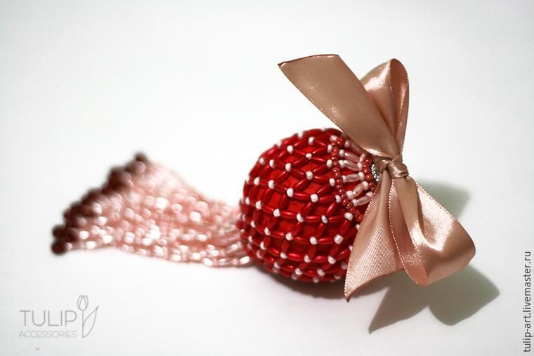 На булавку гвоздик со шляпкой бусинкой, нанизываем красивые разные по размеру бусинки, каждый такой гвоздик вкалываем в поверхность пенопластового шарика. Не забываем приклеить или приколоть ленточку подвеску.