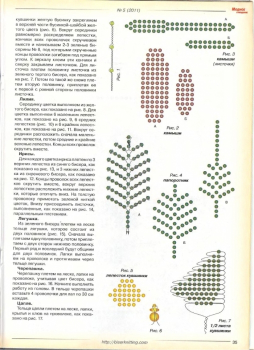 Для каждого цветка ириса плетется по 3 лепестка. Дальше следует плетение листочков. Сначала идут мелкие листики по четвертой схеме. Бисер в листочках: 1, 3, 5, 7, 9, 10, 10, 10, 9, 7, 5, 3. Эти детали будут белого либо светло-зеленого цвета.