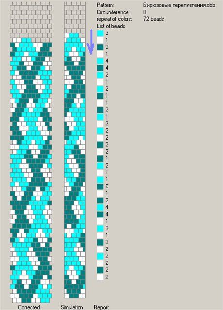 Узенькие схемы, расположенные рядом с основной, отражают внешний вид завершенного жгута. Первая цифра, расположенная в верхнем правом углу стандартной схемы, обычно означает число бисеринок в одном ряду.