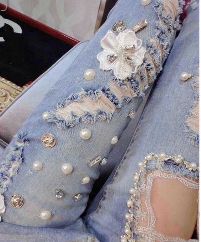 Кружева на джинсовой ткани – контрастный декор. Можно пристрочить их на задний карман, или пришить к поясу, подчеркивая обнажённый животик. Оригинально смотрится кружевной «лампас», тянущийся по всей длине штанины по боковому шву.