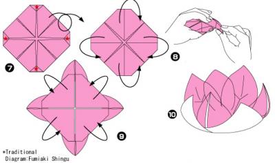 Несмотря на то, что цветок лотоса появляется из болотной воды, после того как прорастет, он выглядит совершенно чистым. Поэтому данный цветок является символом чистоты. Чтобы сделать оригами-цветок лотоса вам понадобится большой квадратный лист бумаги. Стоит отметить, что придется много складывать лист, и с каждым разом он будет становиться все меньше, а значит, чтобы удобнее было собрать цветок, лист должен быть немаленький. Схема оригами-цветка