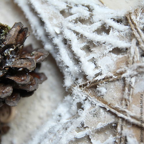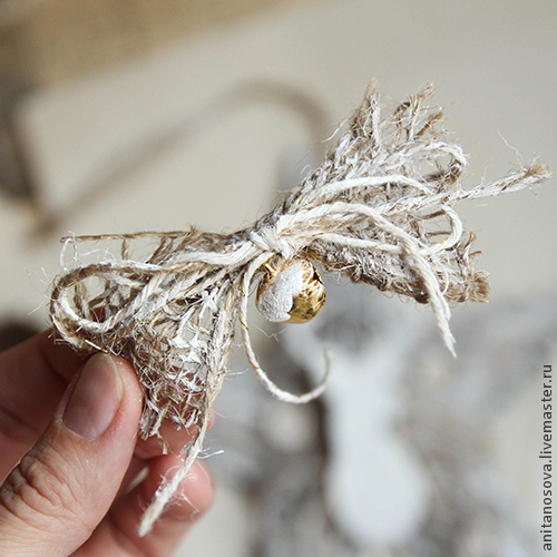 13. Собираем вот такой бантик. Для этого на кусочек мешковины горячим пистолетом крепим бантик связанный из хозяйственного и х/б декоративного шнура, посерединке мы крепим бубенчик. И конечно же немного пачкаем краской, Дед Мороз побывал и здесь :)