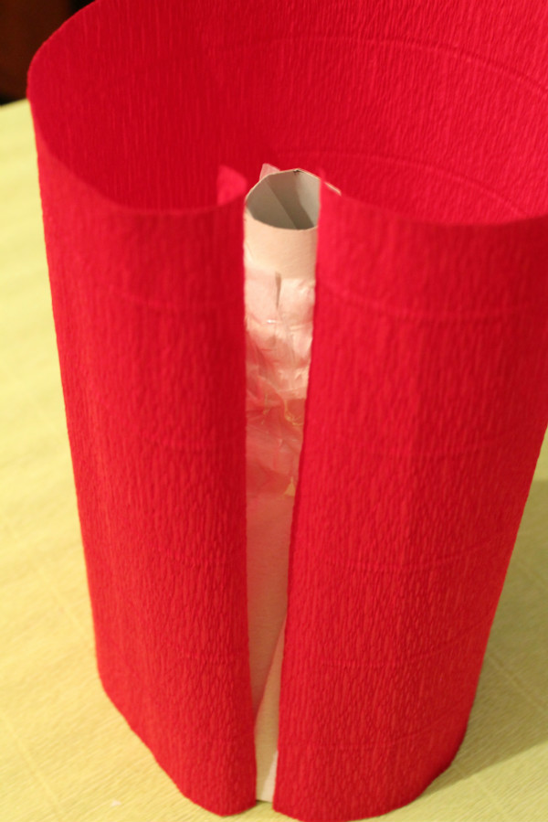 Когда наши складки приклеились, скрепки убираем. Затем не большим отрезом гофробумаги закрываем верх, чтобы юбочка выглядела аккуратно.