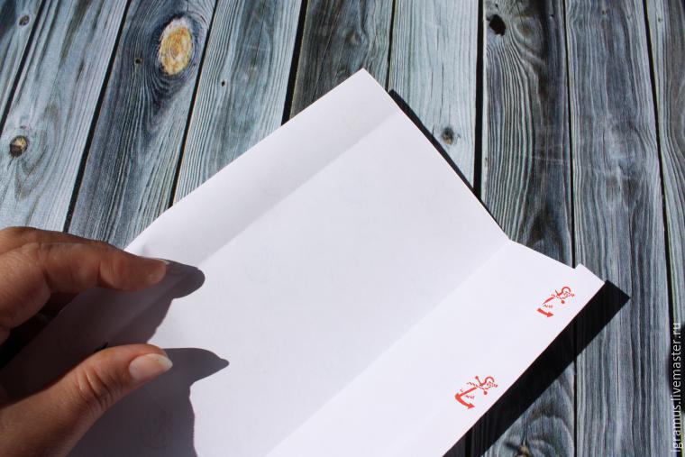 Этапы складывания пакетика. По пунктирным линиям можно пробиговать пакетик (продавить линии палочкой) или сразу складывать: 1. Вырезанный пакетик переворачиваем вверх ногами и складываем крайнее крыло на всю его ширину. Разглаживаем: