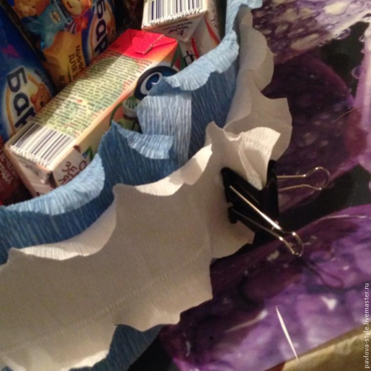 Второй слой — это коробка с печеньем. Ее тоже нужно обклеить тканью, используя двухсторонний скотч. Вырежьте полоску из гофрированной бумаги, шириной 4 см. Приклейте вырезанную ленточку на средний слой, как оборку. Прикрепите к бокам сладости с помощью двухстороннего скотча.