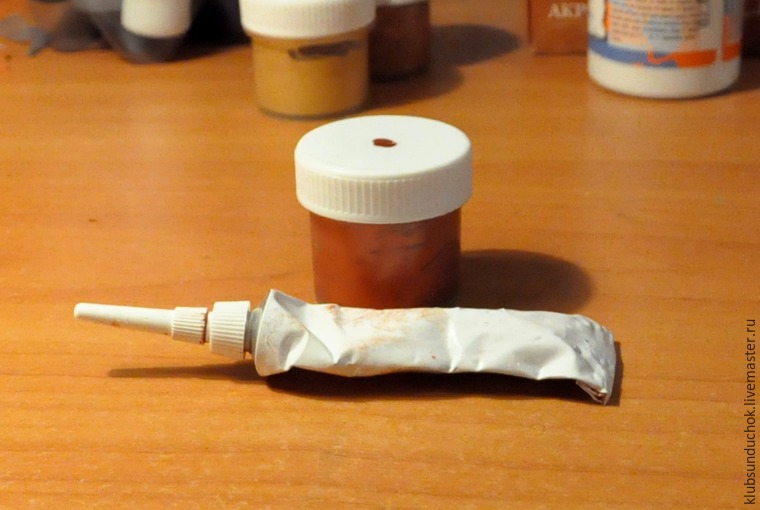 А вот баночки с акриловой краской, почти полные, тех же оттенков. Правда, фирмы «Луч».