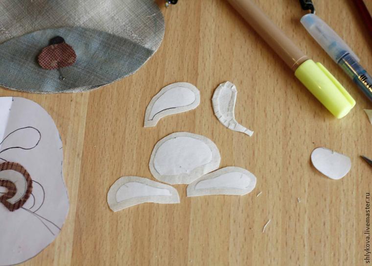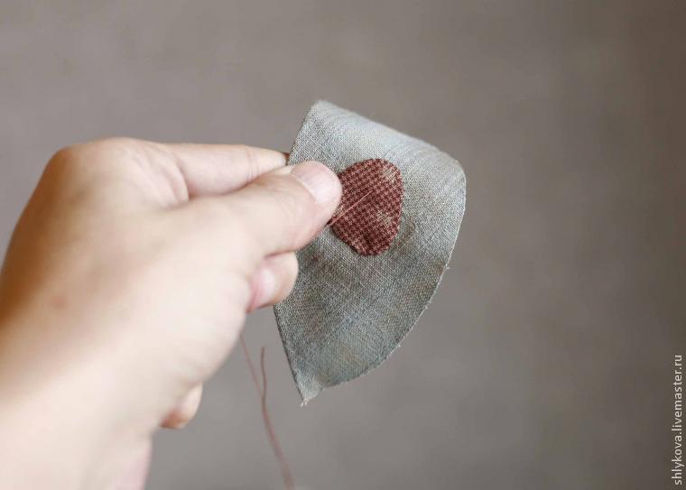 14. Голову пришиваем, начиная снизу, стремимся к тайным стежкам. Когда пришиваем верх шапочки, немного натягиваем аппликацию.