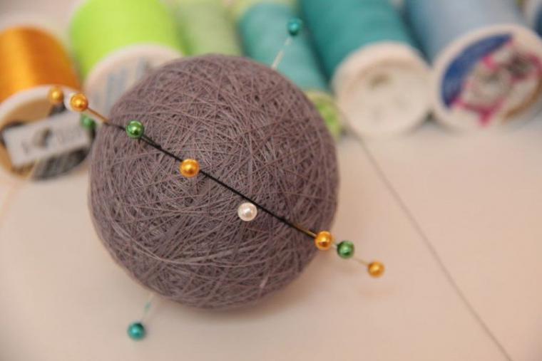 С чего начать?Итак, японские шары темари по сути своей представляют собой клубки из обрезков ткани, смотанных в шар. Что-то типа тех клубочков, из которых ваша бабушка вязала коврики-кружки. Но это только внутри. Для придания поверхности шара большей гладкости его дополнительно обматывают тонкими нитками. Вы следуете за мыслью? Вот, возьмите любой ненужный клубок страшненькой или некачественной шерсти (или создайте шар из обрезков ткани) и обматывайте его любыми швейными нитками. Периодически посматривайте на шарик. Замечаете? Чем меньше остаётся видно его «внутренностей», тем более гладкой и ровной становится его форма. Не стесняйтесь иногда поправлять шар, ужимая его в руках. Он податливый, ничего не стоит выровнять его форму. Когда основа совсем скроется под нитками, оставьте длинный конец, а остальное обрежьте. Небольшими стежками в разных направлениях прошейте обмотку, чтобы нитки не сползали и не сбивались. Итак, основа готова. Как подступиться к вышивке темари?Японская вышивка темари, как и вообще любое японское искусство, требует тщательной подготовки. Нет, создание основы – это ещё не подготовка, сложности ещё впереди! Самое сложное в японской вышивке шаров темари – это точная и ровная разметка шара. Да, шар расшивают только по разметке. Иначе ровно и красиво не получится. Для разметки используют обычные английские булавки с цветными шариками на концах. Мы ещё только начинаем, поэтому сделаем самую простую разметку для самой простой техники «квадраты». Для этого нам понадобится 6 булавок и длинная полоска бумаги шириной не более 1 см. Можно отрезать, например, от тетрадного листка. Для начала воткните булавку в любое место шара через край вашей бумажной полоски – это будет первый «полюс». Полоской оберните шар, как бы рисуя экватор. Не спешите. Убедитесь, что полоска проходит через другой полюс, а не в стороне от него. Всё точно? тогда отогните полоску там, где она вновь встретилась с булавкой. Теперь её длина практически равна окружности шара. Приложите сгиб полоски к проколу, согните полоску точно пополам. Вы нашли середину. А теперь ещё разок пополам – получим точки экватора. На месте сгиба прорежьте полоску, чтобы удобно было втыкать в шар разметочные булавки. Теперь постарайтесь ещё раз обернуть полоску вокруг шара через полюс, не сбоку. На месте среднего перегиба полоски отметим булавкой второй полюс. На месте двух других точек перегиба – точки на экваторе шарика, противоположные друг другу. Пришла пора убедиться, что точки действительно находятся друг напротив друга. Это просто. Углубите булавки в шар-темари до самых головок, возьмитесь за них пальцами одной руки, и просто покрутите шар вокруг оси. При любом угле поворота вы должны видеть, что удерживаете пальчиками именно противоположные полюса, а не точки рядом с ними. Если вы видите обратное, попробуйте переделать разметку. Не с первого раза, но у вас получится. Когда вы убедились, что полюса и точки на экваторе противоположны друг другу, вам остаётся отметить только ещё две точки. Для этого бумажной полоской соедините две точки экватора и на экваторе отметьте ещё две точки, равноудалённые и от полюсов, и от уже имеющихся у нас экваториальных точек. Их тоже проверьте на ровное расположение. С помощью полоски проверьте, действительно ли все точки равноудалены 