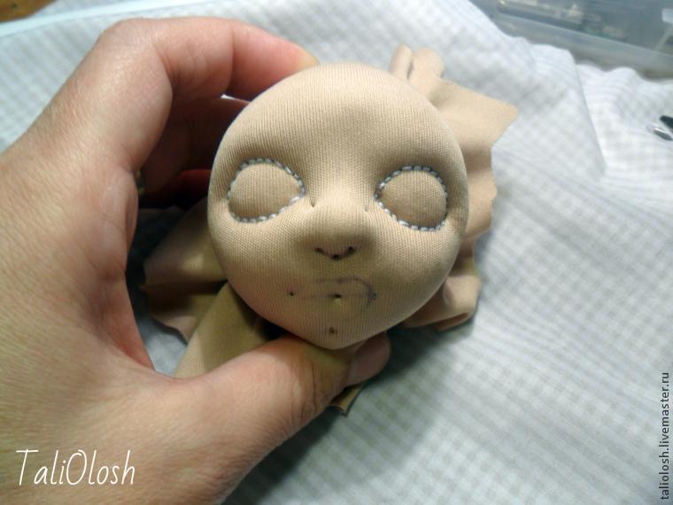 Здесь фотопроцесс утяжек я сокращу, в блоге есть ограничения по количеству фото в МК, а их еще много... И подробный процесс утяжек уголков глаз есть во второй части http://www.livemaster.ru/topic/904719-sozdanie-obemnoj-tekstilnoj-kukolnoj-golovki-chast-vtoraya?vr=1&inside=1. Теперь утягиваем только уголки глаз,