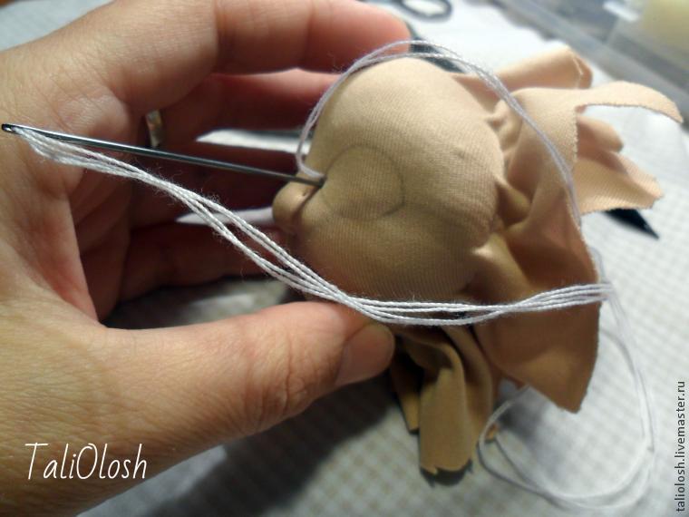 Теперь зашиваем трикотаж на затылке, сильно стягивая его ниткой, сначала первый слой. Здесь мы можем удалить нитку, которой пришивали трикотаж к головке на первом слое.