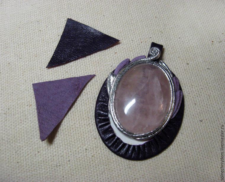 20. Затем делаем такой же жгут из кожи третьего дополнительного цвета. Вырезаем из него полосочки длиной, примерно, 3 см, срезая края под углом 45 град. Потом складываем полосочки пополам и фиксируем клеем. У нас получились маленькие «капельки», которыми мы будем обрамлять верх нашего кулона.