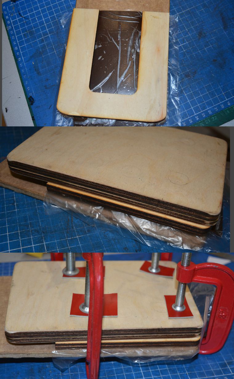 Затем аккуратно одеваем рамку на макет, сверху прижимаем плотной доской. Я использую фанеру склеенную в несколько слоев, и зажимаем все это дело струбцинами крест на крест (фиксируем струбцины постепенно крест на крест).