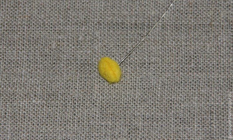 После высыхания лака прокалываем отверстие в центре цветка и нанизываем его на тычинку, которую смазываем клеем у основания головки.