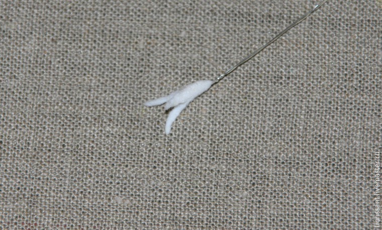 Готовим тычинки, заготовку из белого фетра крепим к проволоке, прокручиваем между пальцами, подклеиваем у основания и придаём форму затем обрабатываем лаком.