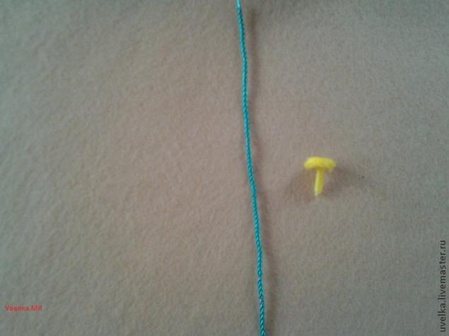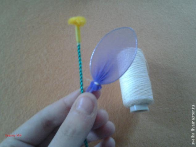 Есть и альтернативный вариант. Чтобы изготовить тычинку таким способом, край куска желтого капрона зажимают, согнув отрезок проволоки длиной чуть большей размера детали, которую хотят получить. Затем плотно оборачивают им стержень и фиксируют его внизу нитью. Далее все просто: