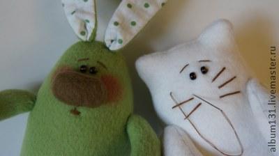 6.Вышиваем бровки ,рисуем румянами щечки зайчику и вышиваем усы котику,пришиваем сверху носы.
