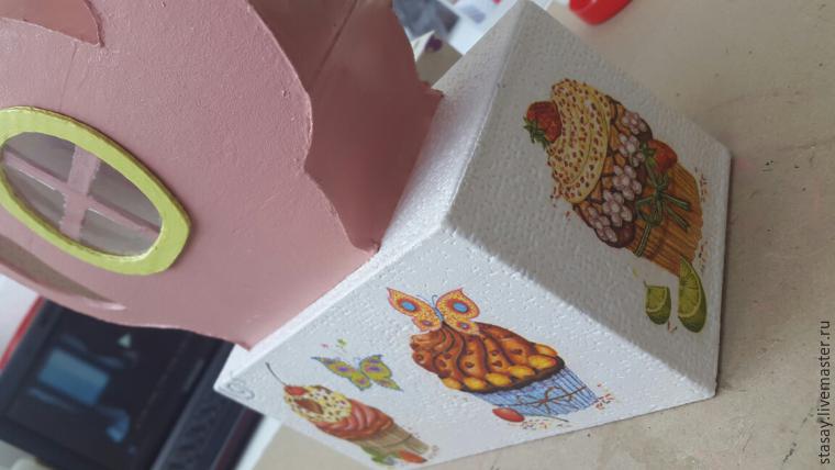 Для того чтобы картинки на домике выглядели ярко, картонную основу покрывают белой акриловой краской в 2 слоя. От салфетки отделяются все ненужные слои и остаётся только часть с рисунком. Стены домика, на которые будет приклеена салфетка, как следует смазываются клеем. Приклеивается салфетка от центра к краям, чтобы максимально избежать пузырей и неровностей. Поверх рисунка тоже наносится слой клея. Последующее декорирование на своё усмотрение: пустые части можно покрыть мелкими кусочками яичной скорлупы, добавить рисунок акриловыми красками или имитацию кирпичной кладки.