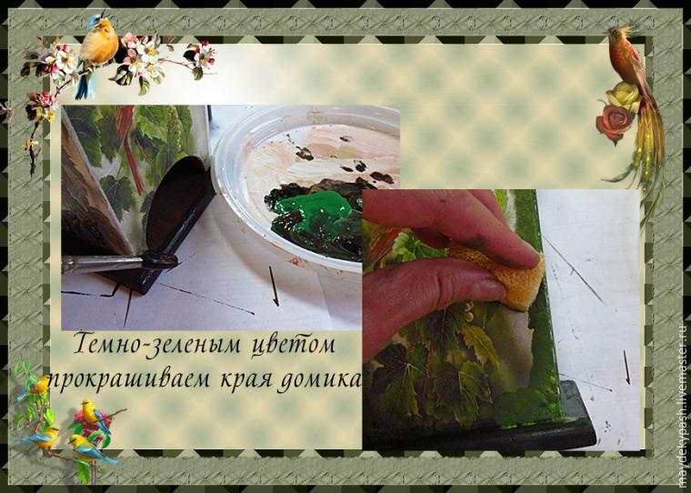 Смешиваем темно-зеленую краску и прокрашиваем края домика, подставку. Углы домика оттеняем темным цветом. «Чпокаем» мелкой губкой. Хорошо для этого использовать косметический спонжик.