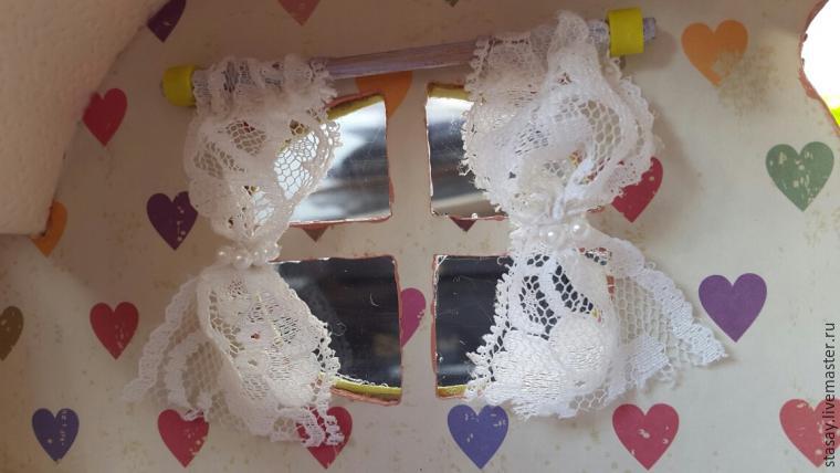 Нам на окошко нужны нежненькие шторки. Берем два отреза какой-нибудь красивой ткани (у меня пито кружево), шпажку, две бусины и любую тесьму или тоненькие ленточки. Можно нанизать бисер разноцветный или однотонный на ниточку. Можно продеть через колечки, фурнитура от старой бижу. В общем все, на что способна ваша фантазия.