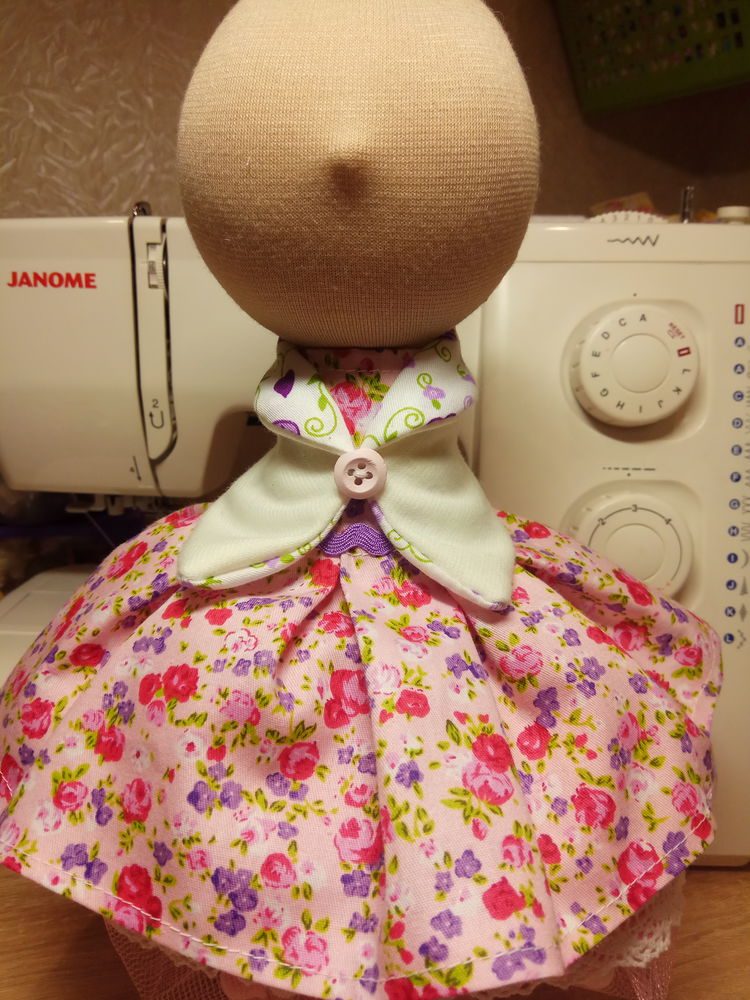 Если будут вопросы с удовольствием отвечу! Желаю всем весеннего настроения и приятного творчества! www.livemaster.ru Шьём текстильную куколку / ЯСегодня я расскажу и покажу, как сшить интерьерную куклу. Я знаю, что мастер-классов по таким куклам очень много. Но у каждого мастера свои техники и свои особенности пошива. В данном мастер-классе я постаралась очень подробно рассказать, как это делаю я. Думаю, что такой материал подойдет даже для новичков без опыта. Итак, приступим. ![]() ![]() ![]() Для пошива туловища вам потребуется трикотаж. Можно приобрести трикотаж, который почти не тянется. Чаще всего встречается он под названием «Белый ангел». Я для своих работ использую самый простой трикотаж из магазина ткани. Для того, чтобы он не сильно тянулся, я проклеиваю его флизелином. Проклеиваю с изнанки ткань, кроме того места, где будет голова. Складываю и скалываю лицом друг к другу, обрисовываю выкройку, прошиваю, вырезаю и выворачиваю. Детали сшиваются не полностью. Остаются места для выворачивания и место, куда вставляется шар для головы. На следующей картинке видно — там, где пробелы, мы ткань не сшиваем. Вот что в итоге получается.![]() Очень важный момент! Части тела вырезаем ножницами зигзаг. Если у вас таких нет, то вырезаем обычными и обязательно делаем небольшие насечки в местах сгибов, например на шее. Просто берем этот обрезанный край и аккуратно, не доходя до шва пары миллиметров, подрезаем. После того как мы прошили все детальки, нам нужно доработать ножки. Берем ножку, складываем ее в районе стопы, как на фото (шов к шву) и чертим закругленную линию. Прострачиваем по этой линии. Вырезаем. Вот что у нас должно получиться.![]() Выворачиваем детали при помощи деревянной палочки. Приступаем к голове. Нам потребуется пенопластовый шарик 8 мм в диаметре. Вырезаем из синтепона круг, такой, чтобы он полностью покрывал шарик, если его обернуть. Оборачиваем шарик и засовываем его в голову через не зашитое сверху пространство. Мои куколки с носиком. Если вы не хотите делать нос своей кукле, то следующий пункт можете пропустить. Для носика нам потребуется английская булавка с бусинкой на конце, кусочек синтепона, нитка и клей. Итак, берем булавку. Наносим клей на кончик пластиковой бусинки. Оборачиваем полоской синтепона. Затем этот рулончик на бусинке складываем пополам. Обвязываем ниткой основание этого шарика. Вот как это выглядит: Необходимая полоска синтепона. Рулончик, обмотанный вокруг невидимки. Этот рулончик мы сложили пополам и замотали у основания ниткой. Намечаем на лице невидимкой, где у нас будет нос. Аккуратно отодвигаем ткань и на месте, где иголка входит в шар, вставляем наш носик, а невидимку убираем.![]() ![]() Зашиваем сверху голову.![]() Теперь самый ответственный и сложный момент — шея. Для шеи вам потребуется деревянная палочка. Я использую китайские палочки. Обрезаю их и затачиваю конец. Можно использовать деревянные шпажки, но они более ломкие. У меня была ситуация, что такая шпажка сломалась, когда я вставляла ее в шар. А также потребуется полоска синтепона и клей. Вырезаем полоску синтепона в ширину, равную длине палочки до заострения, а длину такую, чтобы при сворачивании в рулон получился охват шеи примерно. Палочку смазываем клеем и, начиная с конца, сворачиваем синтепон рулоном вокруг палочки — как ковер. Вот, что у вас должно получит