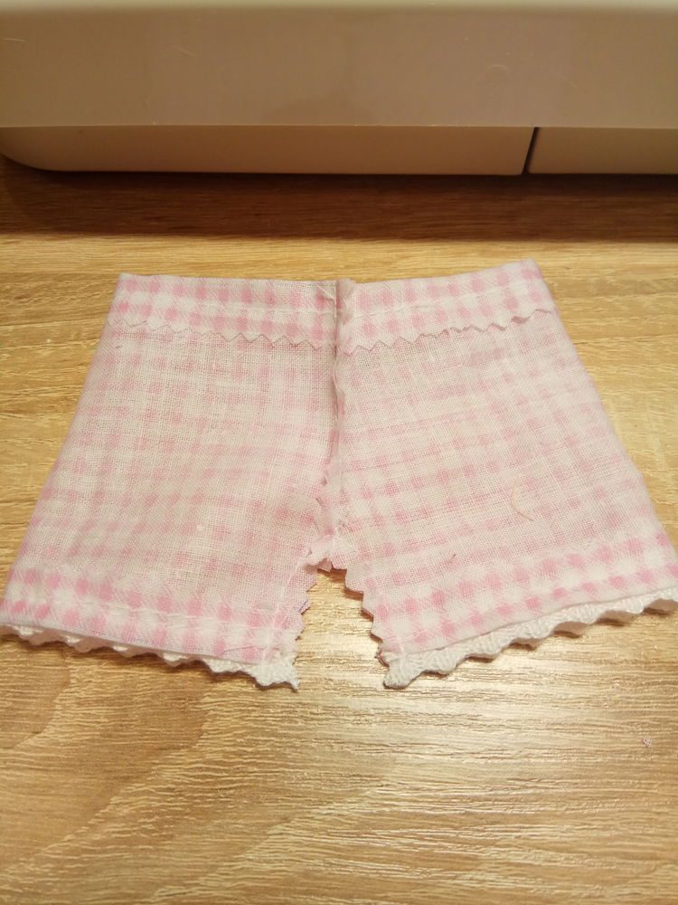 Пришел черед сшить платье для куклы. Выкройка платья представляет собой два прямоугольника, которые сшиваются по коротким сторонам (строчка проложена от верхнего среза на 1 см, затем оставлены не застроченными участки шва 2 см для вдевания ручек куклы, и далее строчка идет до нижнего среза платья).