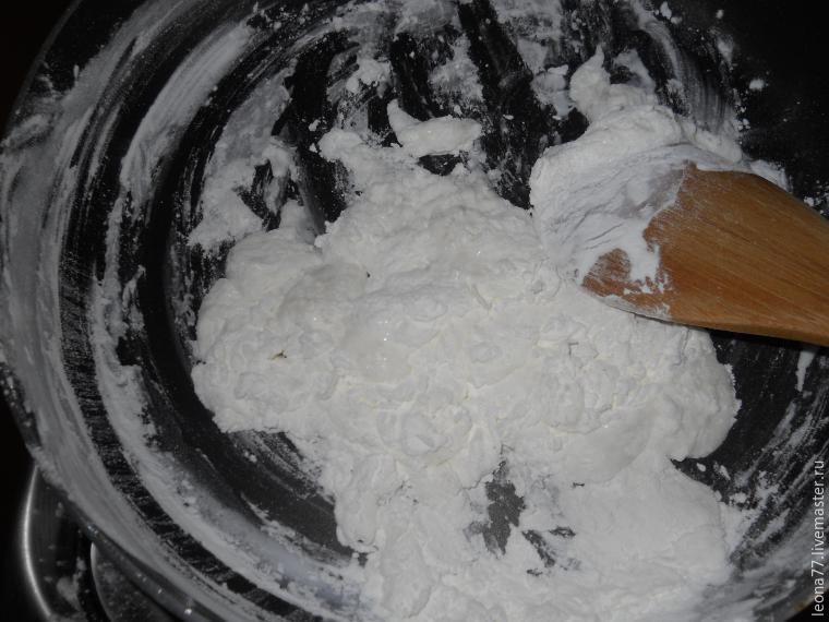 Вы в это время вымойте сковороду и все, что было с клеем. Клей быстро отмывается простым моющем средством и горячей водой. После этого протрите руки влажной салфеткой и сухим вафельным полотенцем (иначе все останется в фарфоре), припудрите руки в крахмале и начинайте интенсивно вымешивать массу. Масса должна быть теплой, не горячей, иначе будет клейстер. Я на доске не вымешиваю, а делаю это в руках — разминаю, как пластилин, растягиваю, сминаю и так далее. Если прилипает к рукам, чуть припудрите массу и продолжайте в течении 5 минут. Масса должна получиться пластичной (не рваться), мягкой, бархатистой, белоснежной.