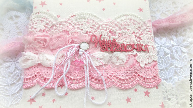 По желанию можете предусмотреть завязки (мне они кажутся здесь лишними). Обратите внимание! Здесь декор я не приклеиваю и не прошиваю, а просто прикидываю, как все будет лежать и как все это будет выглядеть. Почему? Да потому что я сначала прошиваю обложку по периметру швейной машинкой. Так работа выглядит аккуратной и законченной.
