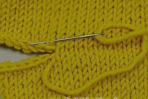 | Если у кромок расположены лицевые петли. Подхватывайте поочередно каждую лицевую петлю то у одной, то у другой кромки за дугу в центре. В результате на линии шва из половинок формируется лицевая петля. | |