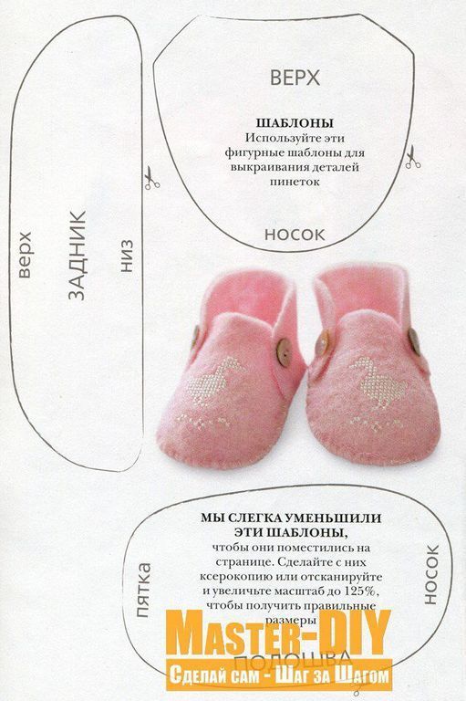 Но смысл построения выкройки от этого не меняется. Все так же обводим подошву, только зауживать никакие места не нужно. И верх создаем по тому же принципу, что был описан ранее. Вырез на пинетке-тапочке, если он необходим, делается на глаз. Только предварительно замеряется расстояние от кончиков пальцев до предположительного его начала. В данном случае верх и боковые части кроятся одной деталью. Делается шов сзади, а затем верхняя часть при помощи потайного шва присоединяется к нижней. Плотной подошвы у пинеток нет, поэтому в данном случае все соединяется при помощи иголки с ниткой. И, конечно же, не забывайте об украшении.