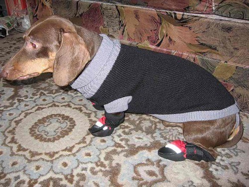 Мастерицы ручного вязания полюбят одевать своих такс в свитера и комбинезоны. Для работы потребуются спицы № 3 или 4, лучше на леске, чтобы проводить примерки в ходе вязания, и около 200 граммов ниток средней толщины. Самой популярной моделью является свитер-реглан. Его вязание начинают с горловины, предварительно рассчитав плотность полотна.