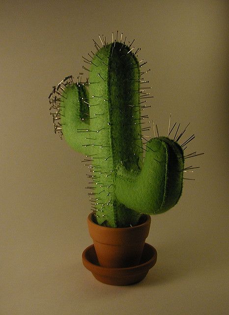 Ну вот и вышел у нас славный кактус, в который так приятно художественно втыкать иголки и булавки! А в горшочек можно положить предметы первой необходимости, к примеру нитки.