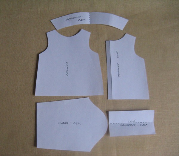 Детали раскроя: спинка (деталь со сгибом), полочка (2 шт), рукав (2 шт), манжет (2 шт), воротник (2шт).