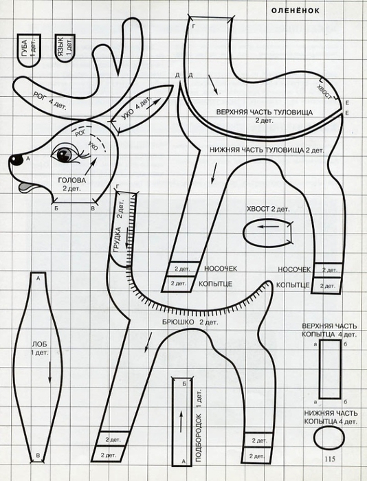 Выкройки новогоднего оленя из фетра и ткани для украшения дома и декорирования, куклы тильды