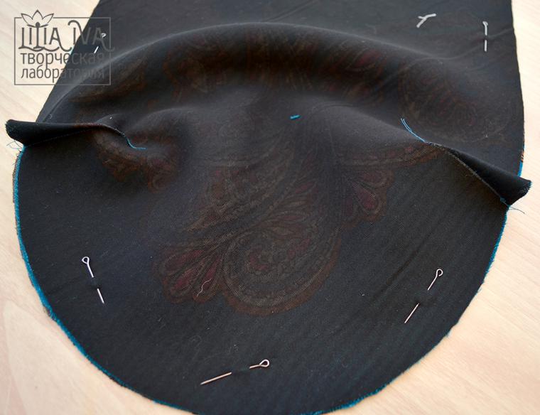 Соединяем деталь шапки и деталь подкладки лицевыми сторонами друг к другу и сшиваем: