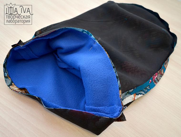 Через отверстие в подкладке по платочной части шапки даем строчку на расстоянии 1 мм от края, подвернув запас шва в сторону лицевой части шапки: