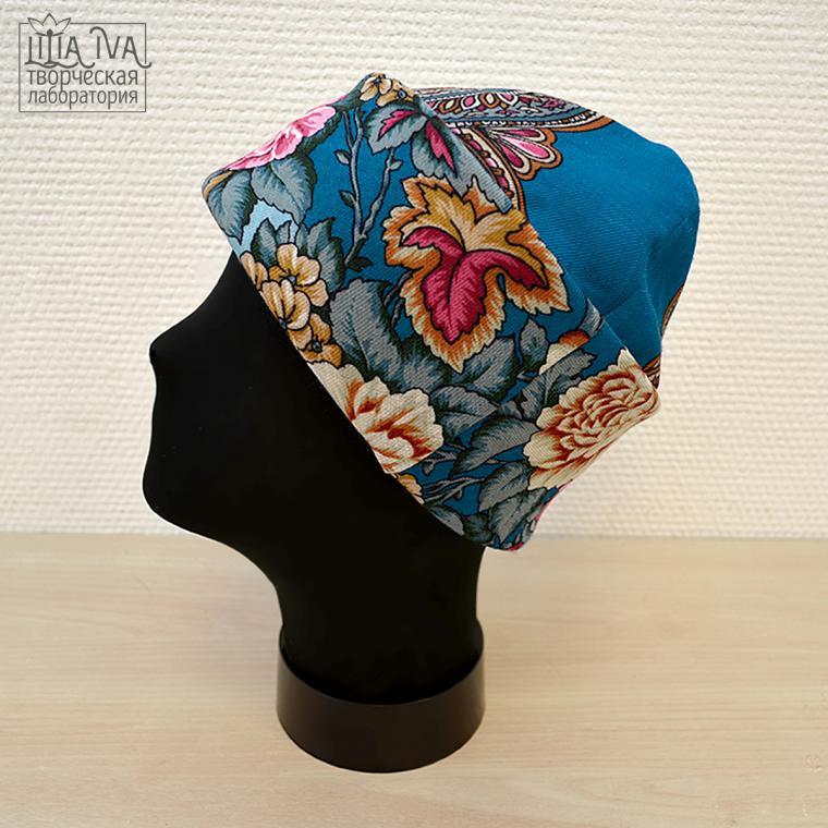 Перед тем как приступить к работе^ проклеиваем наш платок тонким трикотажным дублирином. Делается это для того, чтобы немного стабилизировать ткань платка и изделие прослужило долго. А на швах в процессе носки не образовывались «оскалы». Итак, раскладываем на столе предварительно продублированный платок, выбираем ту часть рисунка, которую мы бы хотели видеть на шапке. Кроить будем по лицевой стороне. Самоисчезающим мелом отмечаем на ткани полосу под углом 45 градусов по отношению к долевой нити: