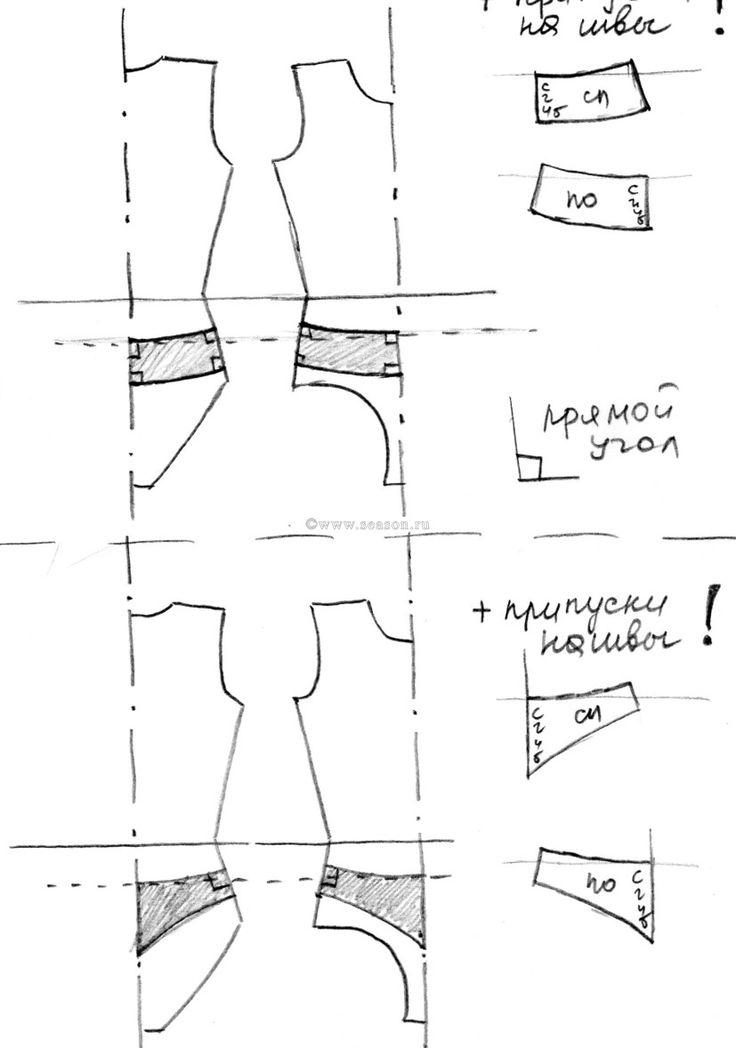 На деталях бумажной выкройки 1 и 3 срезать части цельнокроеного подборта по линиям сгибов.