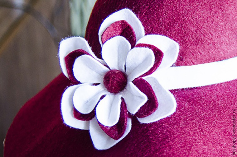 4. Вырезаем из белого фетра полоску 1,5 см и пришиваем к шляпке. Сбоку крепим цветок. Шляпка готова.