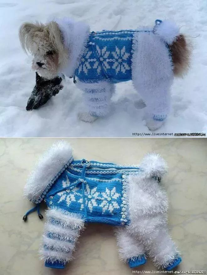 Шапочка может застегиваться на пуговицы или завязываться на шнурочки. Если вы хотите связать собачке зимнюю одежду, помните, что свитер должен быть сделан из теплой качественной пряжи, поэтому независимо от того, свяжете ли вы его сами, или купите в магазине, лучше отказаться от акрила в пользу натуральной шерсти. В силу анатомических особенностей, свитер также очень удобен для кобелей. Свитер или вязаная жилетка отлично подойдут для теплой зимы. Однако для прогулки в снежную или влажную погоду лучше использовать непромокаемые модели теплой одежды для собак.