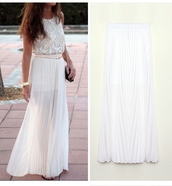 - юбка-солнце – эффектный вариант на каждый день. Идеально подходит для летнего гардероба. Может быть с поясом или на резинке. Это универсальные модели, которые хороши для всех женщин, независимо о комплектации. Длинная шифоновая юбка на резинке выручит обладательницу массивного низа и девушку с фигурой «яблоко».