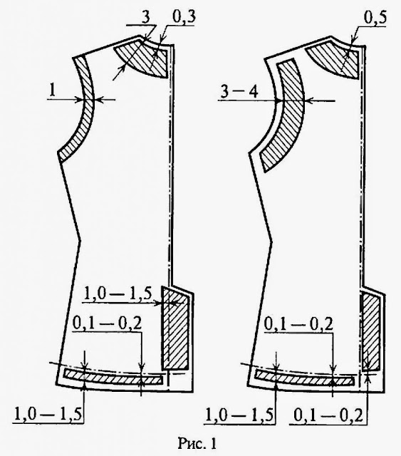 Однако это далеко не так. Первое, что необходимо сделать еще вовремя раскроя – это точно наметить все линии и для боковых швов сделать их плавными, несколько изогнутыми. Затем изделие укладывается на стол и сметывается по бокам и по линиям плеча, причем сметочные стежки должны не доходить до меловых линий. Расстояние между ними примерно в 1-2 миллиметра.