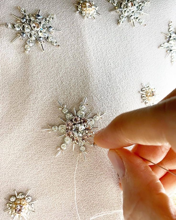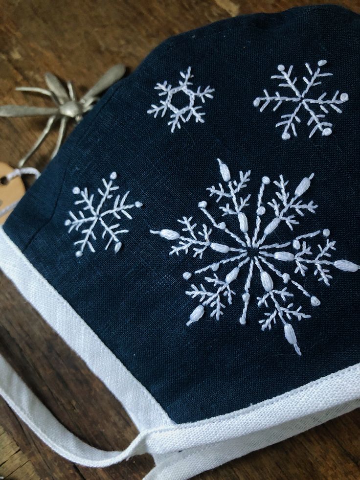 Снежинки аккуратно вырезаются из ткани, пришиваются друг к другу и дополняются вышивкой и пайетками.