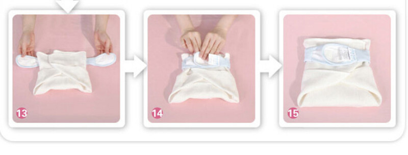 Нижний конец необходимо поднять, пропустить между ног и аккуратно положить на живот. Этот конец должен полностью накрыть ребенка так, чтобы при попадании жидкости не было выливания. Также следует проверить наличие зазоров, их можно удалить перемещением марли.