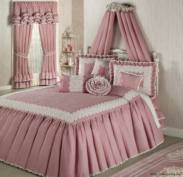 - рюши и вставки на подушках и покрывале из того же материала, что и занавеси и т.д.