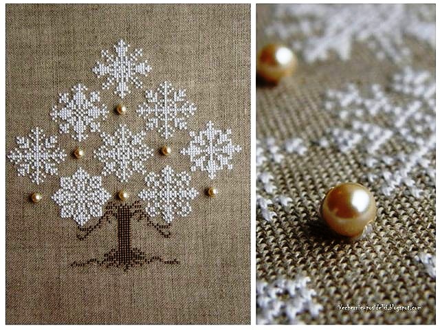 Необычная и очень притягательная идея, вышить сразу несколько снежинок в виде кроны дерева. Такая идея принадлежит мастерице Klarika из Венгрии. Результат её мастерства, как раз на фото ниже.