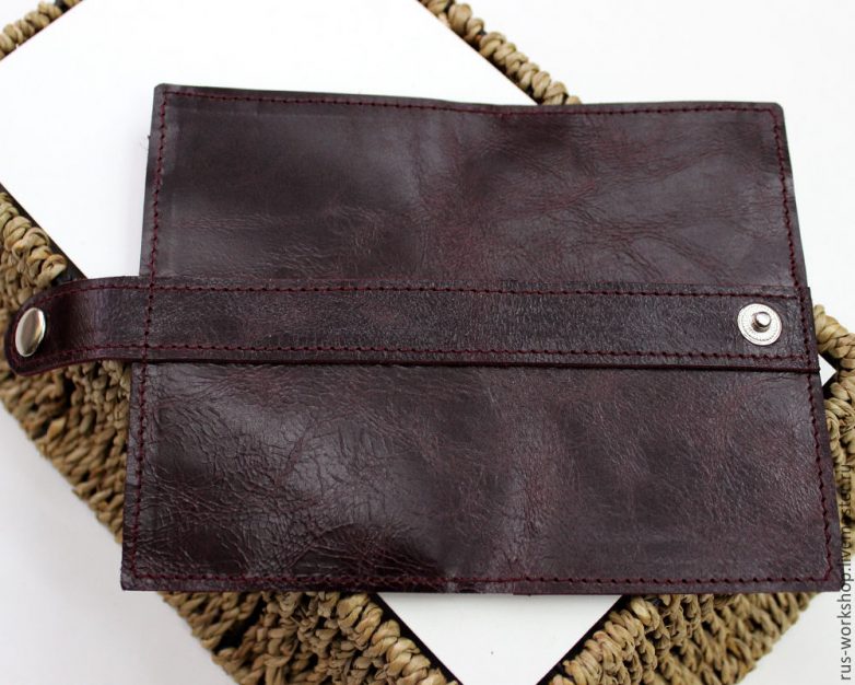 На краях заготовок сделать отверстия шилом по периметру и соединить детали обметочным швом. При этом можно использовать нитки или тонкую тесьму из кожи. Таким же образом обработать края треугольной части конверта. Осталось прикрепить кнопку. Это лучше всего сделать при помощи молотка с наковальней.